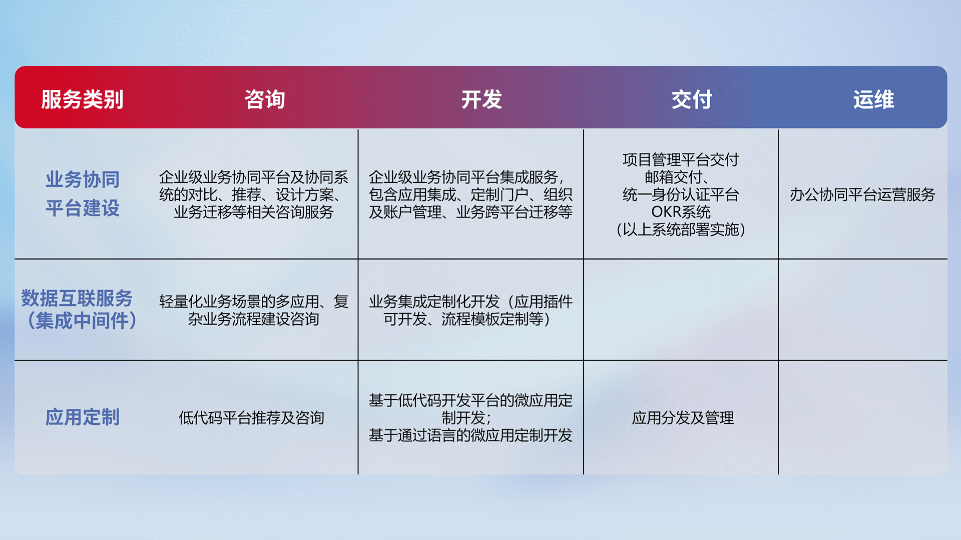 针对钉钉、、企微、、、IDaas等平台级产品提供产品的规划、、方案、、、、交付、、、、定制化开发等服务,,实现如统一协同办公、、智能客户服务、、、混合会议管理、、、、智能数据查询、、等业务场景,,实现数字化转型。。。。